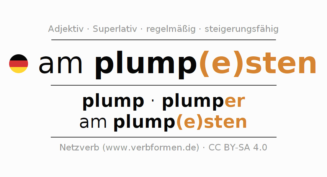 Die am plumpsten Deklination und Steigerung online als Deklinations- und Komparationstabellen mit allen starken, schwachen und gemischten Formen. Diese werden übersichtlich als Tabelle im Singular (Einzahl) und im Plural (Mehrzahl) und in allen vier Fällen Nominativ (auch 1. Fall, Wer-Fall), Genitiv (auch 2. Fall, Wes-Fall, Wessen-Fall), Dativ (auch 3. Fall, Wem-Fall) und Akkusativ (auch 4. Fall, Wen-Fall) dargestellt. Weitere Informationen finden sich unter Wiktionary am plumpsten und unter am plumpsten im Duden.