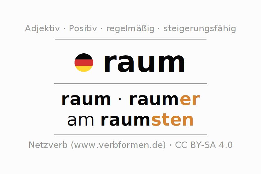Die Deklination des Adjektivs raum erfolgt über die Komparationsformen raum,raumer,am raumsten. Die Endungen für die Steigerung im Komparativ und Superlativ sind er/sten. Das Adjektiv raum kann sowohl attributiv vor einem Nomen mit und ohne Artikel jeweils stark, schwach und gemischt verwendet werden als auch prädikativ in Verbindung mit einem Verb.Man kann hier nicht nur raum deklinieren und steigern, sondern alle deutschen Adjektive. Kommentare ☆