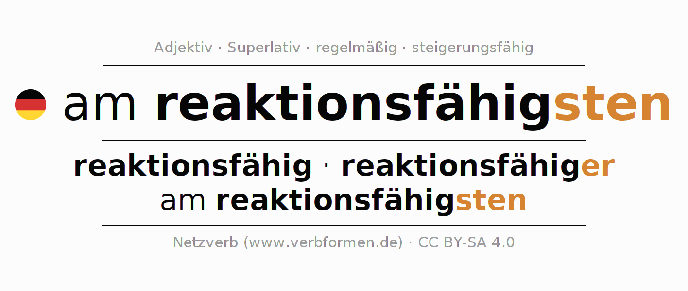 Die am reaktionsfähigsten Deklination und Steigerung online als Deklinations- und Komparationstabellen mit allen starken, schwachen und gemischten Formen. Diese werden übersichtlich als Tabelle im Singular (Einzahl) und im Plural (Mehrzahl) und in allen vier Fällen Nominativ (auch 1. Fall, Wer-Fall), Genitiv (auch 2. Fall, Wes-Fall, Wessen-Fall), Dativ (auch 3. Fall, Wem-Fall) und Akkusativ (auch 4. Fall, Wen-Fall) dargestellt. Weitere Informationen finden sich unter Wiktionary am reaktionsfähigsten und unter am reaktionsfähigsten im Duden.