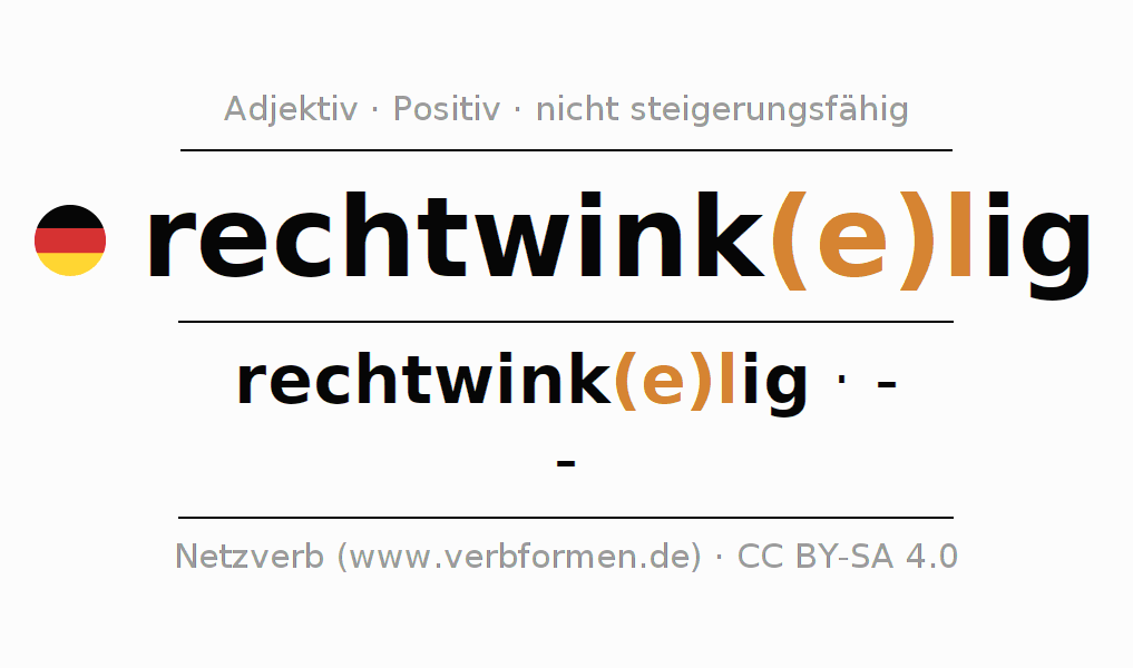 Die rechtwinkelig Deklination und Steigerung online als Deklinations- und Komparationstabellen mit allen starken, schwachen und gemischten Formen. Diese werden übersichtlich als Tabelle im Singular (Einzahl) und im Plural (Mehrzahl) und in allen vier Fällen Nominativ (auch 1. Fall, Wer-Fall), Genitiv (auch 2. Fall, Wes-Fall, Wessen-Fall), Dativ (auch 3. Fall, Wem-Fall) und Akkusativ (auch 4. Fall, Wen-Fall) dargestellt. Weitere Informationen finden sich unter Wiktionary rechtwinkelig und unter rechtwinkelig im Duden.