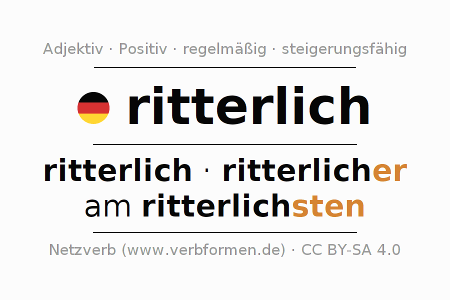 Die Deklination des Adjektivs ritterlich erfolgt über die Komparationsformen ritterlich,ritterlicher,am ritterlichsten. Die Endungen für die Steigerung im Komparativ und Superlativ sind er/sten. Das Adjektiv ritterlich kann sowohl attributiv vor einem Nomen mit und ohne Artikel jeweils stark, schwach und gemischt verwendet werden als auch prädikativ in Verbindung mit einem Verb.Man kann hier nicht nur ritterlich deklinieren und steigern, sondern alle deutschen Adjektive. Kommentare ☆