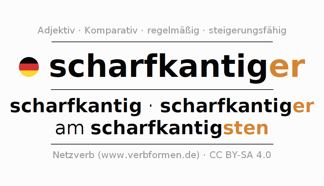 Die Deklination des Adjektivs scharfkantiger erfolgt über die Komparationsformen scharfkantig,scharfkantiger,am scharfkantigsten. Die Endungen für die Steigerung im Komparativ und Superlativ sind er/sten. Das Adjektiv scharfkantiger kann sowohl attributiv vor einem Nomen mit und ohne Artikel jeweils stark, schwach und gemischt verwendet werden als auch prädikativ in Verbindung mit einem Verb.Man kann hier nicht nur scharfkantiger deklinieren und steigern, sondern alle deutschen Adjektive. Kommentare ☆