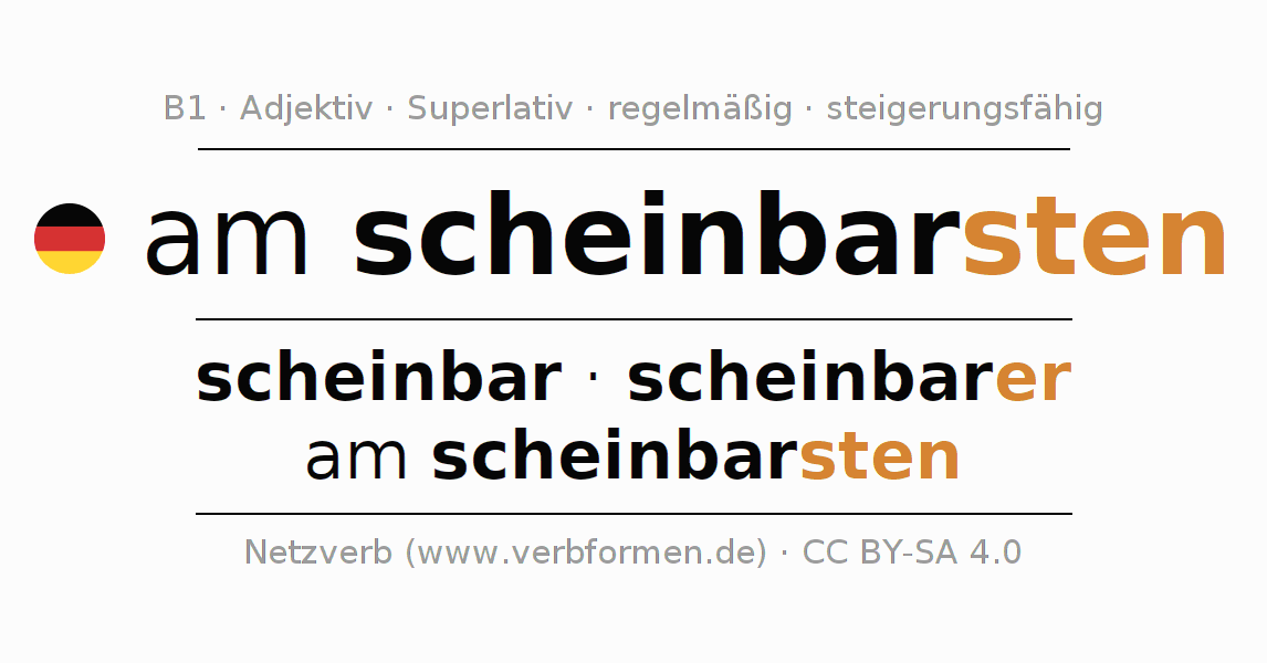 Die am scheinbarsten Deklination und Steigerung online als Deklinations- und Komparationstabellen mit allen starken, schwachen und gemischten Formen. Diese werden übersichtlich als Tabelle im Singular (Einzahl) und im Plural (Mehrzahl) und in allen vier Fällen Nominativ (auch 1. Fall, Wer-Fall), Genitiv (auch 2. Fall, Wes-Fall, Wessen-Fall), Dativ (auch 3. Fall, Wem-Fall) und Akkusativ (auch 4. Fall, Wen-Fall) dargestellt. Weitere Informationen finden sich unter Wiktionary am scheinbarsten und unter am scheinbarsten im Duden.