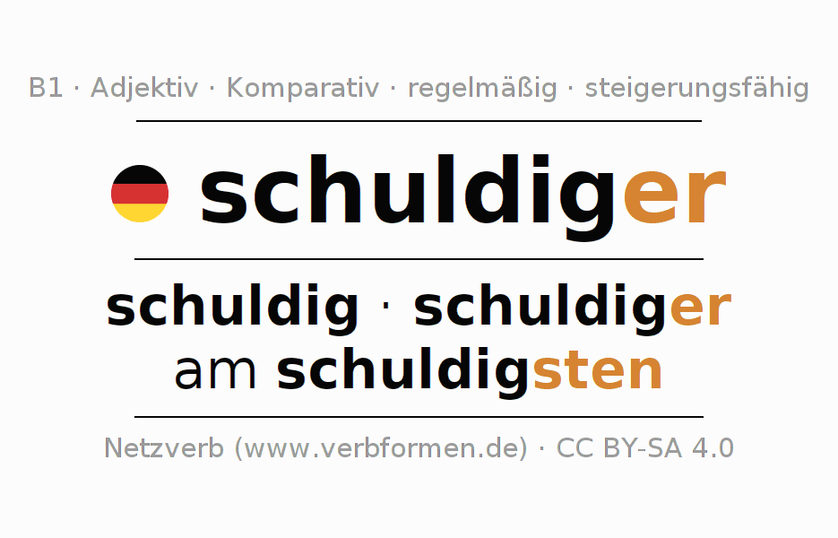 Die Deklination des Adjektivs schuldiger erfolgt über die Komparationsformen schuldig,schuldiger,am schuldigsten. Die Endungen für die Steigerung im Komparativ und Superlativ sind er/sten. Das Adjektiv schuldiger kann sowohl attributiv vor einem Nomen mit und ohne Artikel jeweils stark, schwach und gemischt verwendet werden als auch prädikativ in Verbindung mit einem Verb.Man kann hier nicht nur schuldiger deklinieren und steigern, sondern alle deutschen Adjektive. Kommentare ☆