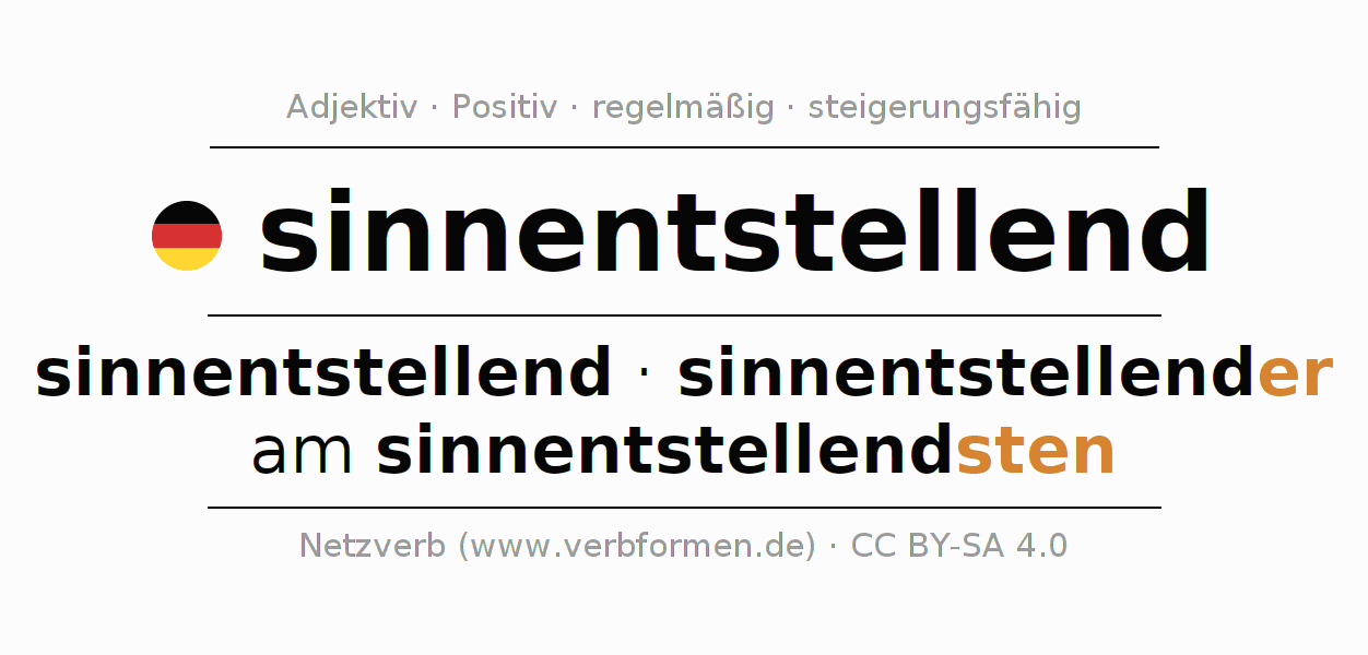 Die Deklination des Adjektivs sinnentstellend erfolgt über die Komparationsformen sinnentstellend,sinnentstellender,am sinnentstellendsten. Die Endungen für die Steigerung im Komparativ und Superlativ sind er/sten. Das Adjektiv sinnentstellend kann sowohl attributiv vor einem Nomen mit und ohne Artikel jeweils stark, schwach und gemischt verwendet werden als auch prädikativ in Verbindung mit einem Verb.Man kann hier nicht nur sinnentstellend deklinieren und steigern, sondern alle deutschen Adjektive. Kommentare ☆