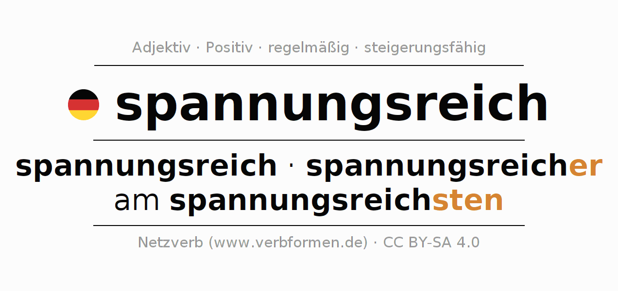 Die Deklination des Adjektivs spannungsreich erfolgt über die Komparationsformen spannungsreich,spannungsreicher,am spannungsreichsten. Die Endungen für die Steigerung im Komparativ und Superlativ sind er/sten. Das Adjektiv spannungsreich kann sowohl attributiv vor einem Nomen mit und ohne Artikel jeweils stark, schwach und gemischt verwendet werden als auch prädikativ in Verbindung mit einem Verb.Man kann hier nicht nur spannungsreich deklinieren und steigern, sondern alle deutschen Adjektive. Kommentare ☆