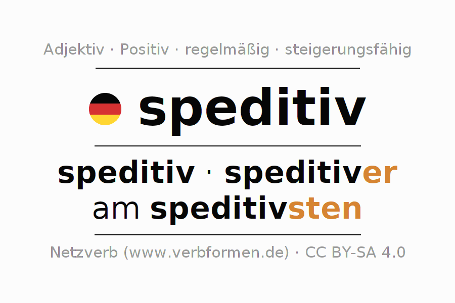 Die Deklination des Adjektivs speditiv erfolgt über die Komparationsformen speditiv,speditiver,am speditivsten. Die Endungen für die Steigerung im Komparativ und Superlativ sind er/sten. Das Adjektiv speditiv kann sowohl attributiv vor einem Nomen mit und ohne Artikel jeweils stark, schwach und gemischt verwendet werden als auch prädikativ in Verbindung mit einem Verb.Man kann hier nicht nur speditiv deklinieren und steigern, sondern alle deutschen Adjektive. Kommentare ☆