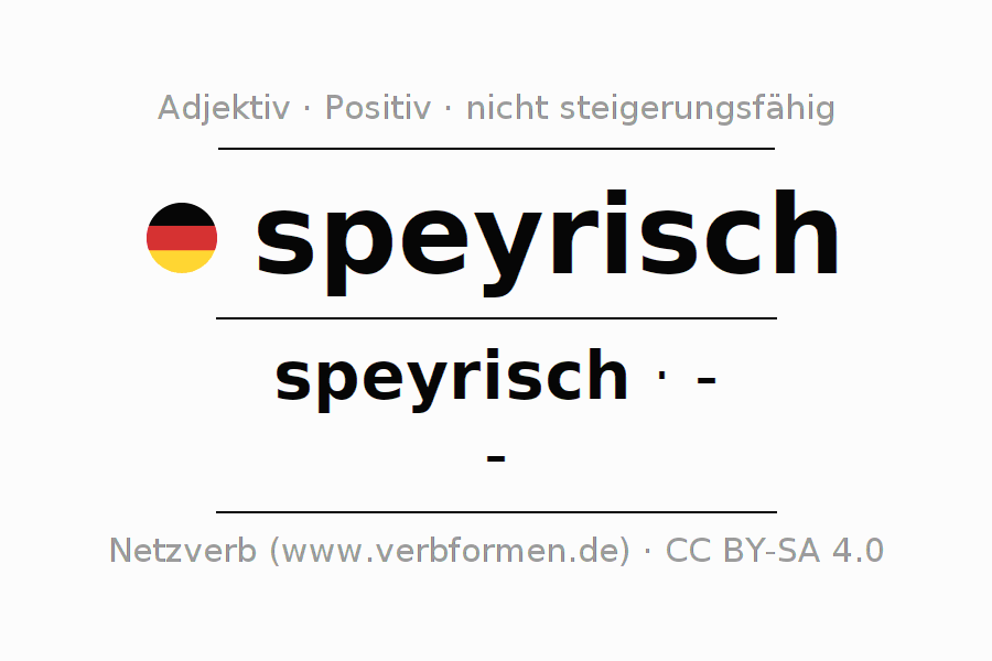 Die speyrisch Deklination und Steigerung online als Deklinations- und Komparationstabellen mit allen starken, schwachen und gemischten Formen. Diese werden übersichtlich als Tabelle im Singular (Einzahl) und im Plural (Mehrzahl) und in allen vier Fällen Nominativ (auch 1. Fall, Wer-Fall), Genitiv (auch 2. Fall, Wes-Fall, Wessen-Fall), Dativ (auch 3. Fall, Wem-Fall) und Akkusativ (auch 4. Fall, Wen-Fall) dargestellt. Weitere Informationen finden sich unter Wiktionary speyrisch und unter speyrisch im Duden.