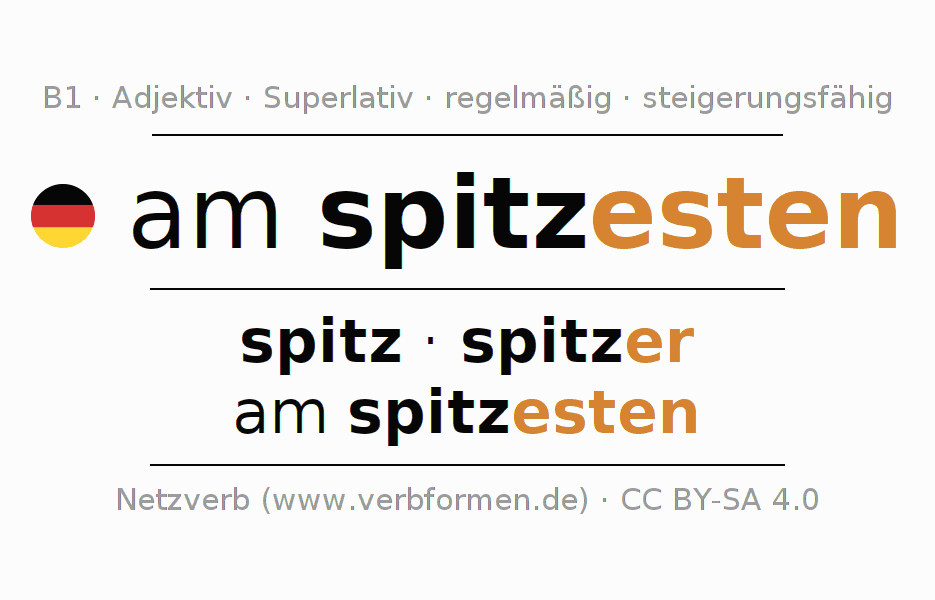 Die Deklination des Adjektivs am spitzesten erfolgt über die Komparationsformen spitz,spitzer,am spitzesten. Die Endungen für die Steigerung im Komparativ und Superlativ sind er/esten. Das Adjektiv am spitzesten kann sowohl attributiv vor einem Nomen mit und ohne Artikel jeweils stark, schwach und gemischt verwendet werden als auch prädikativ in Verbindung mit einem Verb.Man kann hier nicht nur am spitzesten deklinieren und steigern, sondern alle deutschen Adjektive. Kommentare ☆