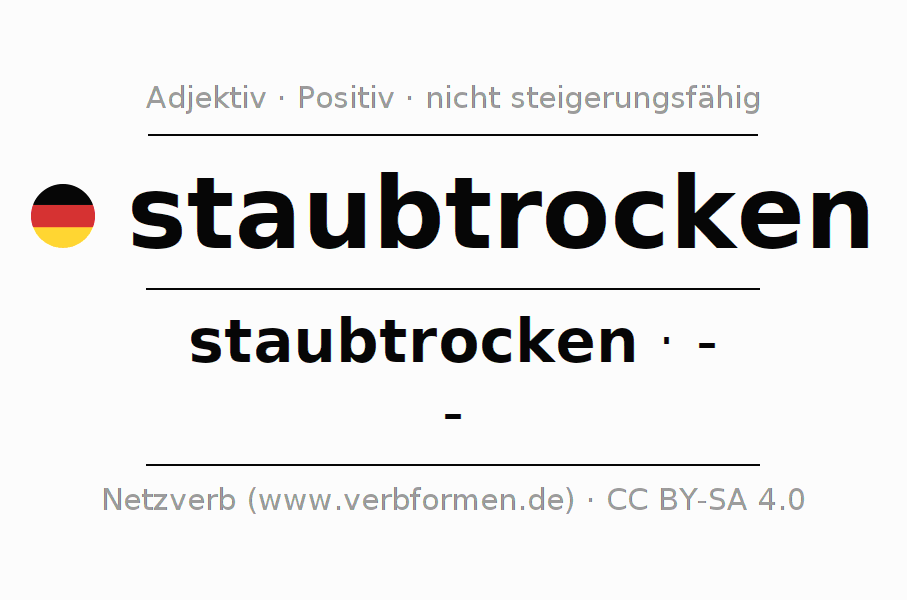 Die staubtrocken Deklination und Steigerung online als Deklinations- und Komparationstabellen mit allen starken, schwachen und gemischten Formen. Diese werden übersichtlich als Tabelle im Singular (Einzahl) und im Plural (Mehrzahl) und in allen vier Fällen Nominativ (auch 1. Fall, Wer-Fall), Genitiv (auch 2. Fall, Wes-Fall, Wessen-Fall), Dativ (auch 3. Fall, Wem-Fall) und Akkusativ (auch 4. Fall, Wen-Fall) dargestellt. Weitere Informationen finden sich unter Wiktionary staubtrocken und unter staubtrocken im Duden.