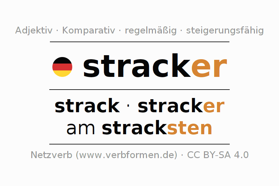 Die Deklination des Adjektivs stracker erfolgt über die Komparationsformen strack,stracker,am stracksten. Die Endungen für die Steigerung im Komparativ und Superlativ sind er/sten. Das Adjektiv stracker kann sowohl attributiv vor einem Nomen mit und ohne Artikel jeweils stark, schwach und gemischt verwendet werden als auch prädikativ in Verbindung mit einem Verb.Man kann hier nicht nur stracker deklinieren und steigern, sondern alle deutschen Adjektive. Kommentare ☆