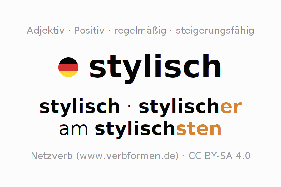 Die Deklination des Adjektivs stylisch erfolgt über die Komparationsformen stylisch,stylischer,am stylischsten. Die Endungen für die Steigerung im Komparativ und Superlativ sind er/sten. Das Adjektiv stylisch kann sowohl attributiv vor einem Nomen mit und ohne Artikel jeweils stark, schwach und gemischt verwendet werden als auch prädikativ in Verbindung mit einem Verb.Man kann hier nicht nur stylisch deklinieren und steigern, sondern alle deutschen Adjektive. Kommentare ☆