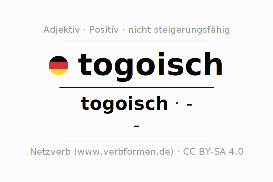 Die Deklination des Adjektivs togoisch erfolgt über die nicht steigerbare Form togoisch. Das Adjektiv besitzt keine Formen für den Komparativ und Superlativ. Das Adjektiv togoisch kann sowohl attributiv vor einem Nomen mit und ohne Artikel jeweils stark, schwach und gemischt verwendet werden als auch prädikativ in Verbindung mit einem Verb.Man kann hier nicht nur togoisch deklinieren und steigern, sondern alle deutschen Adjektive. Kommentare ☆