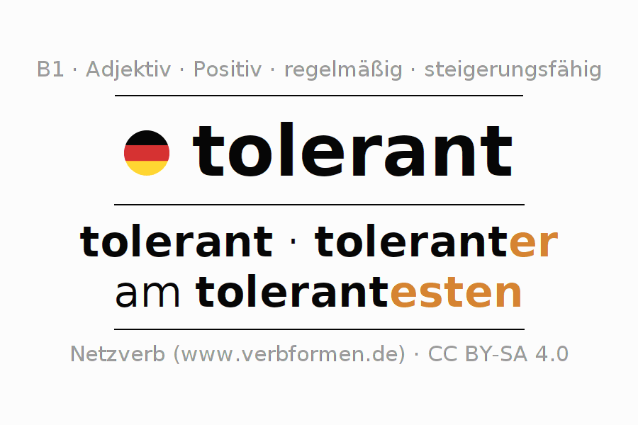 Die Deklination des Adjektivs tolerant erfolgt über die Komparationsformen tolerant,toleranter,am tolerantesten. Die Endungen für die Steigerung im Komparativ und Superlativ sind er/esten. Das Adjektiv tolerant kann sowohl attributiv vor einem Nomen mit und ohne Artikel jeweils stark, schwach und gemischt verwendet werden als auch prädikativ in Verbindung mit einem Verb.Man kann hier nicht nur tolerant deklinieren und steigern, sondern alle deutschen Adjektive. Kommentare ☆