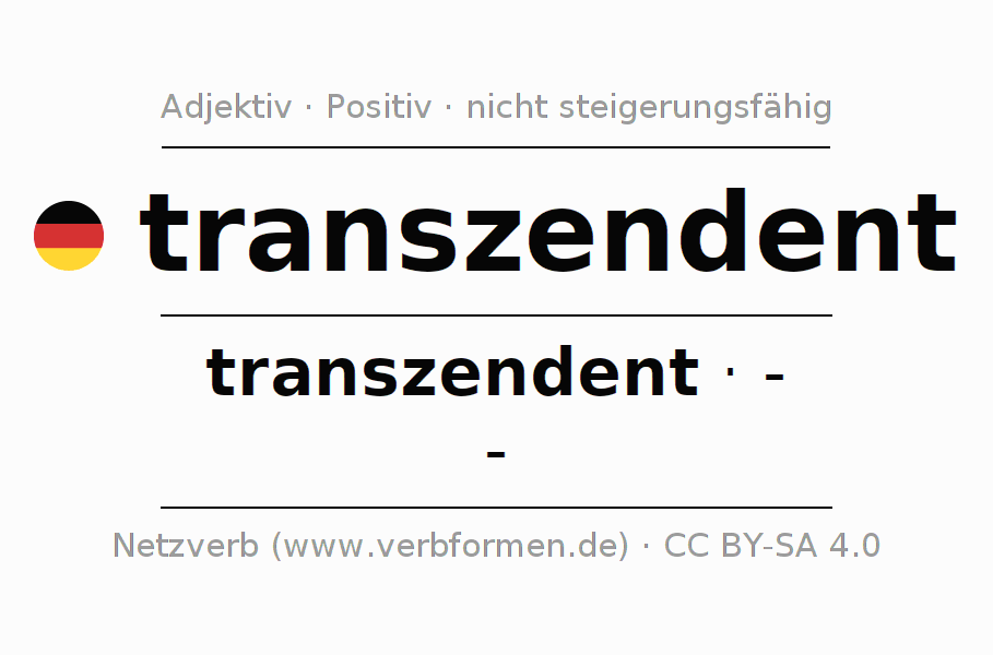 Die transzendent Deklination und Steigerung online als Deklinations- und Komparationstabellen mit allen starken, schwachen und gemischten Formen. Diese werden übersichtlich als Tabelle im Singular (Einzahl) und im Plural (Mehrzahl) und in allen vier Fällen Nominativ (auch 1. Fall, Wer-Fall), Genitiv (auch 2. Fall, Wes-Fall, Wessen-Fall), Dativ (auch 3. Fall, Wem-Fall) und Akkusativ (auch 4. Fall, Wen-Fall) dargestellt. Weitere Informationen finden sich unter Wiktionary transzendent und unter transzendent im Duden.