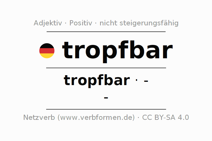 Die Deklination des Adjektivs tropfbar erfolgt über die nicht steigerbare Form tropfbar. Das Adjektiv besitzt keine Formen für den Komparativ und Superlativ. Das Adjektiv tropfbar kann sowohl attributiv vor einem Nomen mit und ohne Artikel jeweils stark, schwach und gemischt verwendet werden als auch prädikativ in Verbindung mit einem Verb.Man kann hier nicht nur tropfbar deklinieren und steigern, sondern alle deutschen Adjektive. Kommentare ☆
