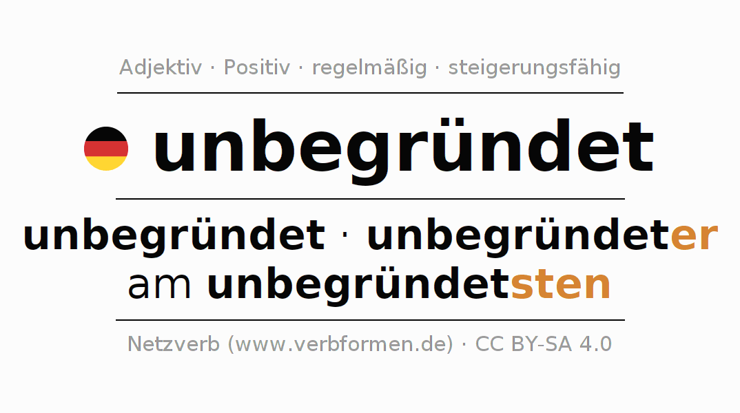 Die Deklination des Adjektivs unbegründet erfolgt über die Komparationsformen unbegründet,unbegründeter,am unbegründetsten. Die Endungen für die Steigerung im Komparativ und Superlativ sind er/sten. Das Adjektiv unbegründet kann sowohl attributiv vor einem Nomen mit und ohne Artikel jeweils stark, schwach und gemischt verwendet werden als auch prädikativ in Verbindung mit einem Verb.Man kann hier nicht nur unbegründet deklinieren und steigern, sondern alle deutschen Adjektive. Kommentare ☆