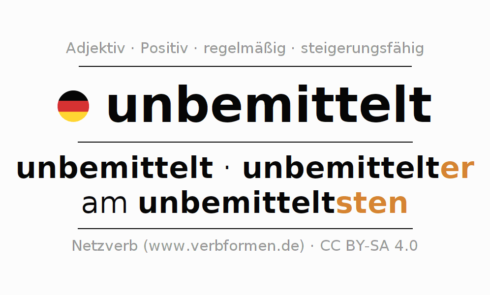Zusammenfassung aller Deklinationsformen und Steigerungsformen des Adjektivs bzw. Eigenschaftswortes unbemittelt in allen Genera und Fällen