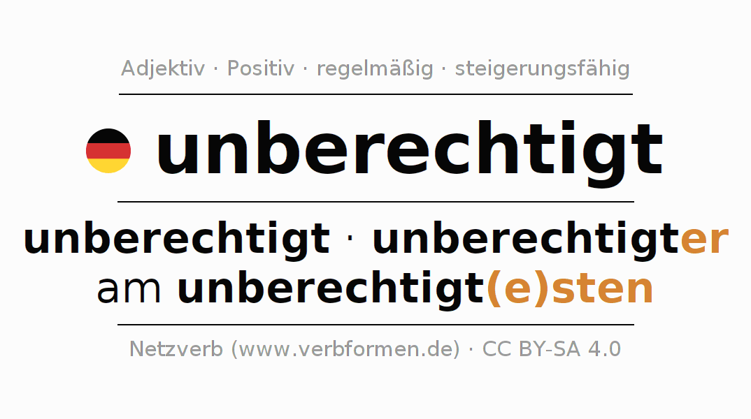 Die unberechtigt Deklination und Steigerung online als Deklinations- und Komparationstabellen mit allen starken, schwachen und gemischten Formen. Diese werden übersichtlich als Tabelle im Singular (Einzahl) und im Plural (Mehrzahl) und in allen vier Fällen Nominativ (auch 1. Fall, Wer-Fall), Genitiv (auch 2. Fall, Wes-Fall, Wessen-Fall), Dativ (auch 3. Fall, Wem-Fall) und Akkusativ (auch 4. Fall, Wen-Fall) dargestellt. Weitere Informationen finden sich unter Wiktionary unberechtigt und unter unberechtigt im Duden.