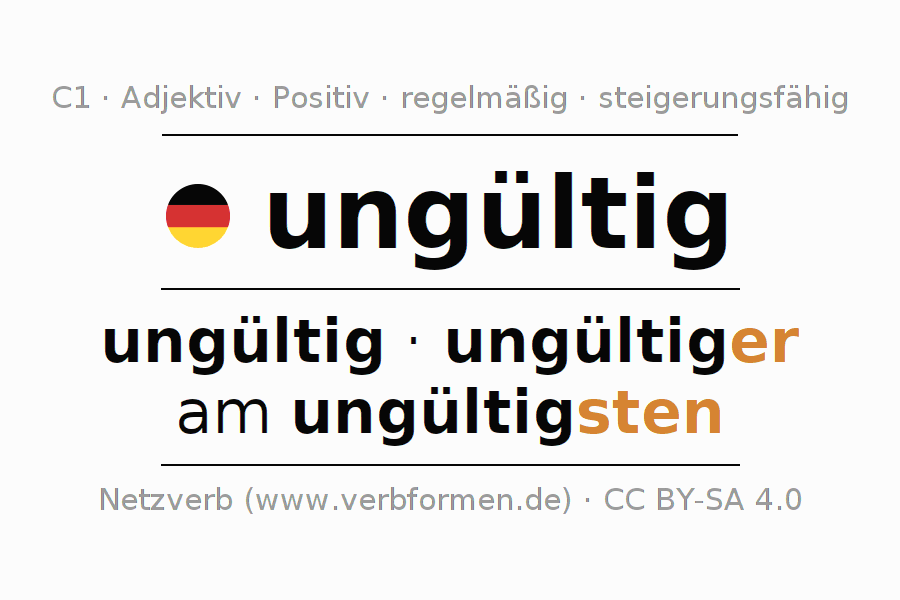 Die Deklination des Adjektivs ungültig erfolgt über die Komparationsformen ungültig,ungültiger,am ungültigsten. Die Endungen für die Steigerung im Komparativ und Superlativ sind er/sten. Das Adjektiv ungültig kann sowohl attributiv vor einem Nomen mit und ohne Artikel jeweils stark, schwach und gemischt verwendet werden als auch prädikativ in Verbindung mit einem Verb.Man kann hier nicht nur ungültig deklinieren und steigern, sondern alle deutschen Adjektive. Kommentare ☆