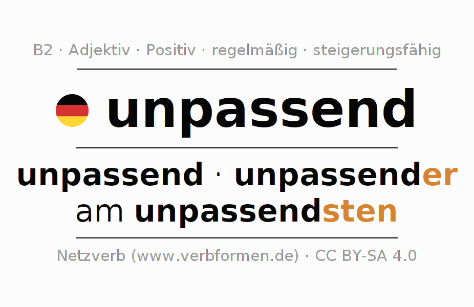 Die Deklination des Adjektivs unpassend erfolgt über die Komparationsformen unpassend,unpassender,am unpassendsten. Die Endungen für die Steigerung im Komparativ und Superlativ sind er/sten. Das Adjektiv unpassend kann sowohl attributiv vor einem Nomen mit und ohne Artikel jeweils stark, schwach und gemischt verwendet werden als auch prädikativ in Verbindung mit einem Verb.Man kann hier nicht nur unpassend deklinieren und steigern, sondern alle deutschen Adjektive. Kommentare ☆