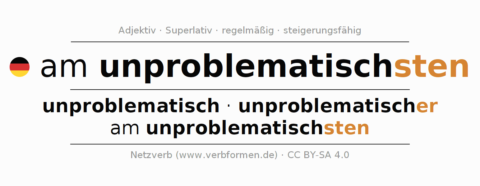Die am unproblematischsten Deklination und Steigerung online als Deklinations- und Komparationstabellen mit allen starken, schwachen und gemischten Formen. Diese werden übersichtlich als Tabelle im Singular (Einzahl) und im Plural (Mehrzahl) und in allen vier Fällen Nominativ (auch 1. Fall, Wer-Fall), Genitiv (auch 2. Fall, Wes-Fall, Wessen-Fall), Dativ (auch 3. Fall, Wem-Fall) und Akkusativ (auch 4. Fall, Wen-Fall) dargestellt. Weitere Informationen finden sich unter Wiktionary am unproblematischsten und unter am unproblematischsten im Duden.