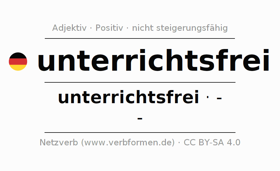 Die unterrichtsfrei Deklination und Steigerung online als Deklinations- und Komparationstabellen mit allen starken, schwachen und gemischten Formen. Diese werden übersichtlich als Tabelle im Singular (Einzahl) und im Plural (Mehrzahl) und in allen vier Fällen Nominativ (auch 1. Fall, Wer-Fall), Genitiv (auch 2. Fall, Wes-Fall, Wessen-Fall), Dativ (auch 3. Fall, Wem-Fall) und Akkusativ (auch 4. Fall, Wen-Fall) dargestellt. Weitere Informationen finden sich unter Wiktionary unterrichtsfrei und unter unterrichtsfrei im Duden.