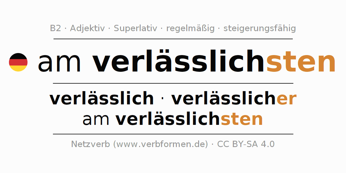 Die am verlässlichsten Deklination und Steigerung online als Deklinations- und Komparationstabellen mit allen starken, schwachen und gemischten Formen. Diese werden übersichtlich als Tabelle im Singular (Einzahl) und im Plural (Mehrzahl) und in allen vier Fällen Nominativ (auch 1. Fall, Wer-Fall), Genitiv (auch 2. Fall, Wes-Fall, Wessen-Fall), Dativ (auch 3. Fall, Wem-Fall) und Akkusativ (auch 4. Fall, Wen-Fall) dargestellt. Weitere Informationen finden sich unter Wiktionary am verlässlichsten und unter am verlässlichsten im Duden.