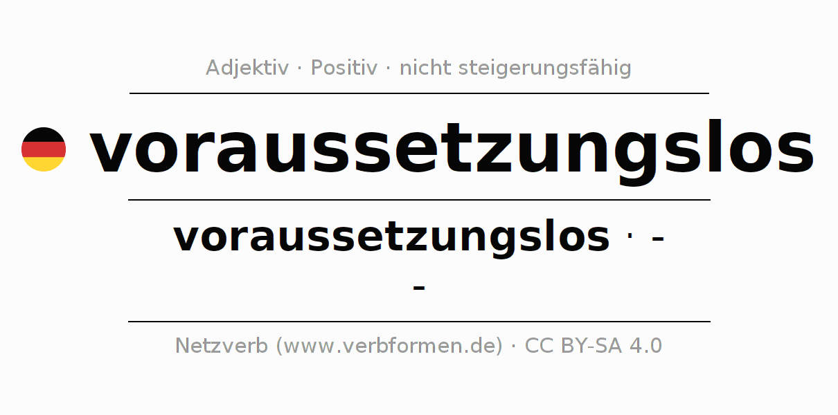 Die voraussetzungslos Deklination und Steigerung online als Deklinations- und Komparationstabellen mit allen starken, schwachen und gemischten Formen. Diese werden übersichtlich als Tabelle im Singular (Einzahl) und im Plural (Mehrzahl) und in allen vier Fällen Nominativ (auch 1. Fall, Wer-Fall), Genitiv (auch 2. Fall, Wes-Fall, Wessen-Fall), Dativ (auch 3. Fall, Wem-Fall) und Akkusativ (auch 4. Fall, Wen-Fall) dargestellt. Weitere Informationen finden sich unter Wiktionary voraussetzungslos und unter voraussetzungslos im Duden.