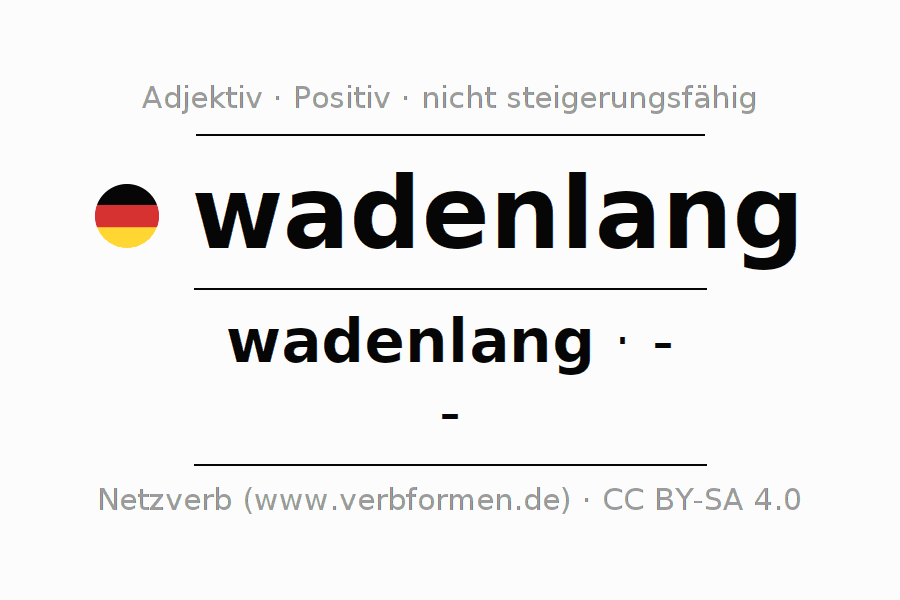 Die wadenlang Deklination und Steigerung online als Deklinations- und Komparationstabellen mit allen starken, schwachen und gemischten Formen. Diese werden übersichtlich als Tabelle im Singular (Einzahl) und im Plural (Mehrzahl) und in allen vier Fällen Nominativ (auch 1. Fall, Wer-Fall), Genitiv (auch 2. Fall, Wes-Fall, Wessen-Fall), Dativ (auch 3. Fall, Wem-Fall) und Akkusativ (auch 4. Fall, Wen-Fall) dargestellt. Weitere Informationen finden sich unter Wiktionary wadenlang und unter wadenlang im Duden.