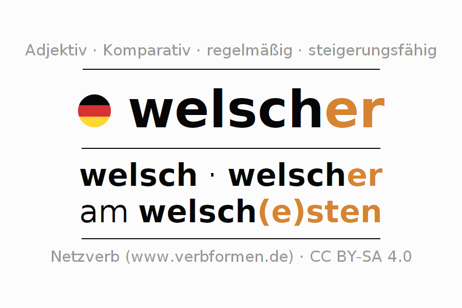 Die Deklination des Adjektivs welscher erfolgt über die Komparationsformen welsch,welscher,am welschesten. Die Endungen für die Steigerung im Komparativ und Superlativ sind er/esten. Das Adjektiv welscher kann sowohl attributiv vor einem Nomen mit und ohne Artikel jeweils stark, schwach und gemischt verwendet werden als auch prädikativ in Verbindung mit einem Verb.Man kann hier nicht nur welscher deklinieren und steigern, sondern alle deutschen Adjektive. Kommentare ☆