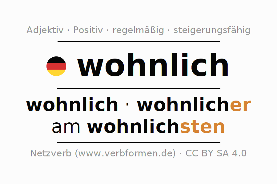Die Deklination des Adjektivs wohnlich erfolgt über die Komparationsformen wohnlich,wohnlicher,am wohnlichsten. Die Endungen für die Steigerung im Komparativ und Superlativ sind er/sten. Das Adjektiv wohnlich kann sowohl attributiv vor einem Nomen mit und ohne Artikel jeweils stark, schwach und gemischt verwendet werden als auch prädikativ in Verbindung mit einem Verb.Man kann hier nicht nur wohnlich deklinieren und steigern, sondern alle deutschen Adjektive. Kommentare ☆
