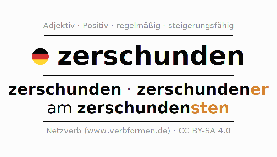 Die zerschunden Deklination und Steigerung online als Deklinations- und Komparationstabellen mit allen starken, schwachen und gemischten Formen. Diese werden übersichtlich als Tabelle im Singular (Einzahl) und im Plural (Mehrzahl) und in allen vier Fällen Nominativ (auch 1. Fall, Wer-Fall), Genitiv (auch 2. Fall, Wes-Fall, Wessen-Fall), Dativ (auch 3. Fall, Wem-Fall) und Akkusativ (auch 4. Fall, Wen-Fall) dargestellt. Weitere Informationen finden sich unter Wiktionary zerschunden und unter zerschunden im Duden.