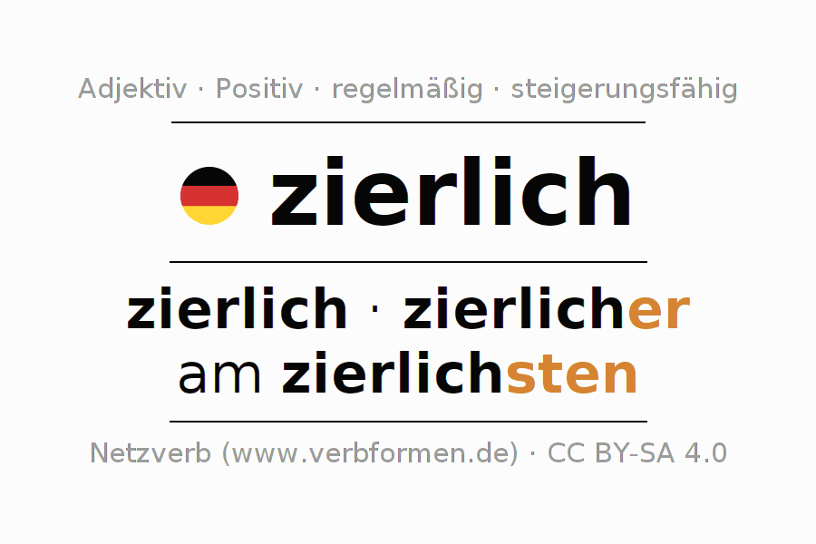 Die Deklination des Adjektivs zierlich erfolgt über die Komparationsformen zierlich,zierlicher,am zierlichsten. Die Endungen für die Steigerung im Komparativ und Superlativ sind er/sten. Das Adjektiv zierlich kann sowohl attributiv vor einem Nomen mit und ohne Artikel jeweils stark, schwach und gemischt verwendet werden als auch prädikativ in Verbindung mit einem Verb.Man kann hier nicht nur zierlich deklinieren und steigern, sondern alle deutschen Adjektive. Kommentare ☆