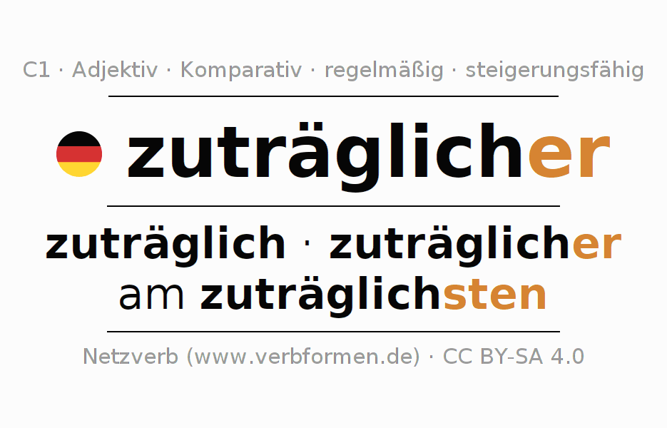 Die Deklination des Adjektivs zuträglicher erfolgt über die Komparationsformen zuträglich,zuträglicher,am zuträglichsten. Die Endungen für die Steigerung im Komparativ und Superlativ sind er/sten. Das Adjektiv zuträglicher kann sowohl attributiv vor einem Nomen mit und ohne Artikel jeweils stark, schwach und gemischt verwendet werden als auch prädikativ in Verbindung mit einem Verb.Man kann hier nicht nur zuträglicher deklinieren und steigern, sondern alle deutschen Adjektive. Kommentare ☆