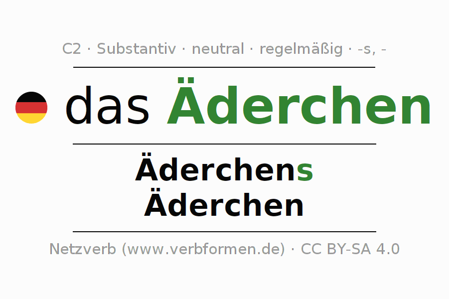 Die Deklination des Substantivs Äderchen ist im Singular Genitiv Äderchens und im Plural Nominativ Äderchen. Das Nomen Äderchen wird stark mit den Deklinationsendungen s/- dekliniert. Das Genus bzw. grammatische Geschlecht von Äderchen ist Neutral und der bestimmte Artikel ist "das". Man kann hier nicht nur Äderchen deklinieren, sondern alle deutschen Substantive. Das Substantiv gehört zum Wortschatz des Zertifikats Deutsch bzw. zur Stufe C2. Kommentare ☆