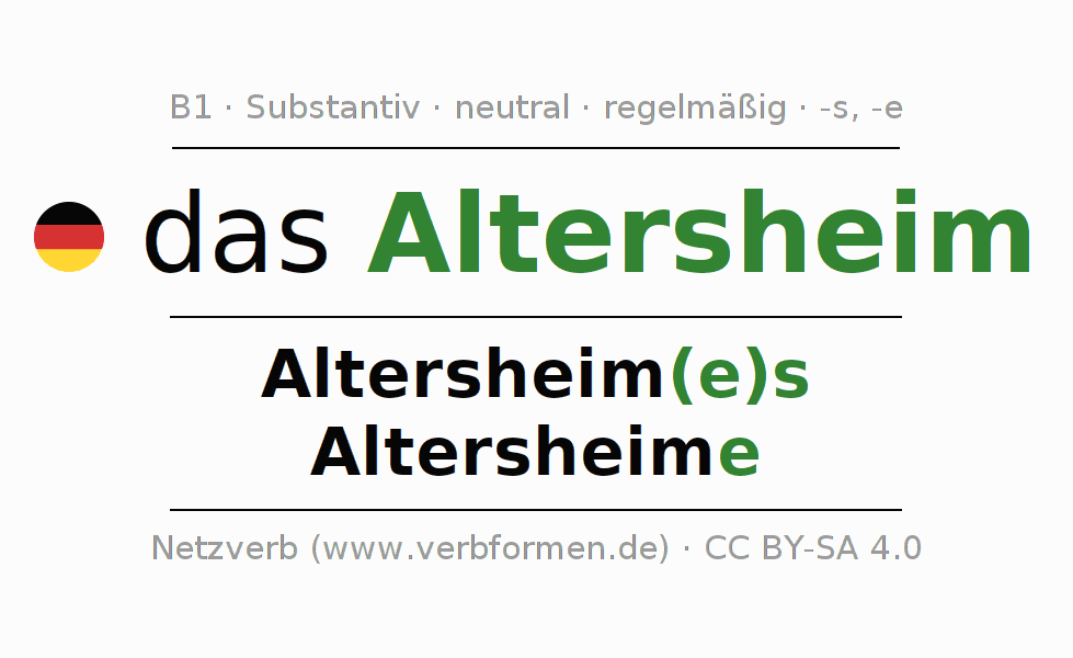 - Singular: das Altersheim, des Altersheim(e)s, dem Altersheim(e), das Altersheim