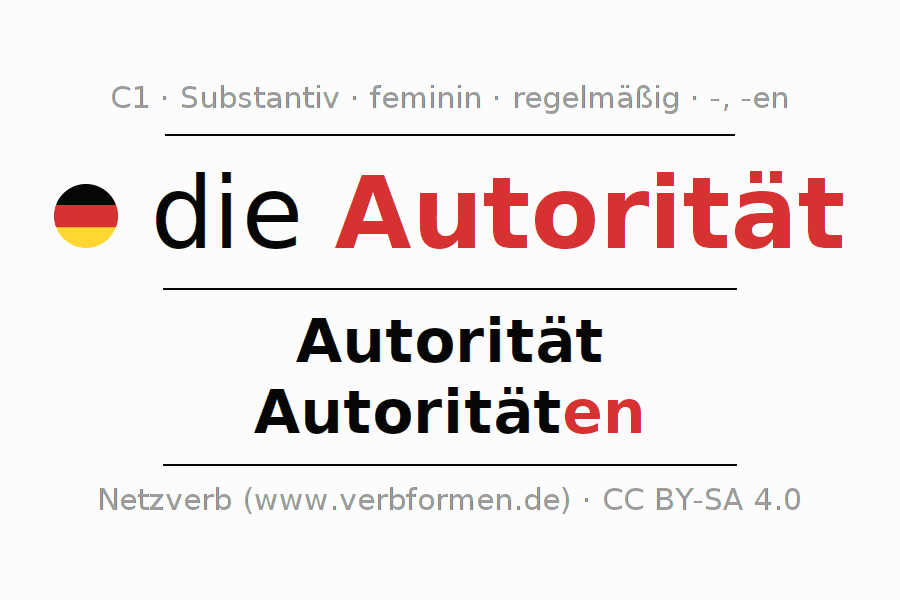 - Plural: die Autoritäten, der Autoritäten, den Autoritäten, die Autoritäten