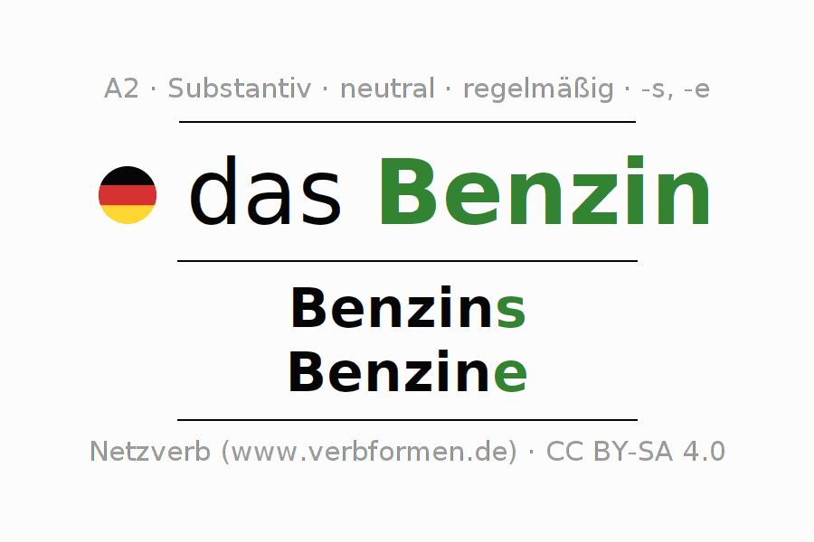 - Singular: das Benzin, des Benzins, dem Benzin, das Benzin