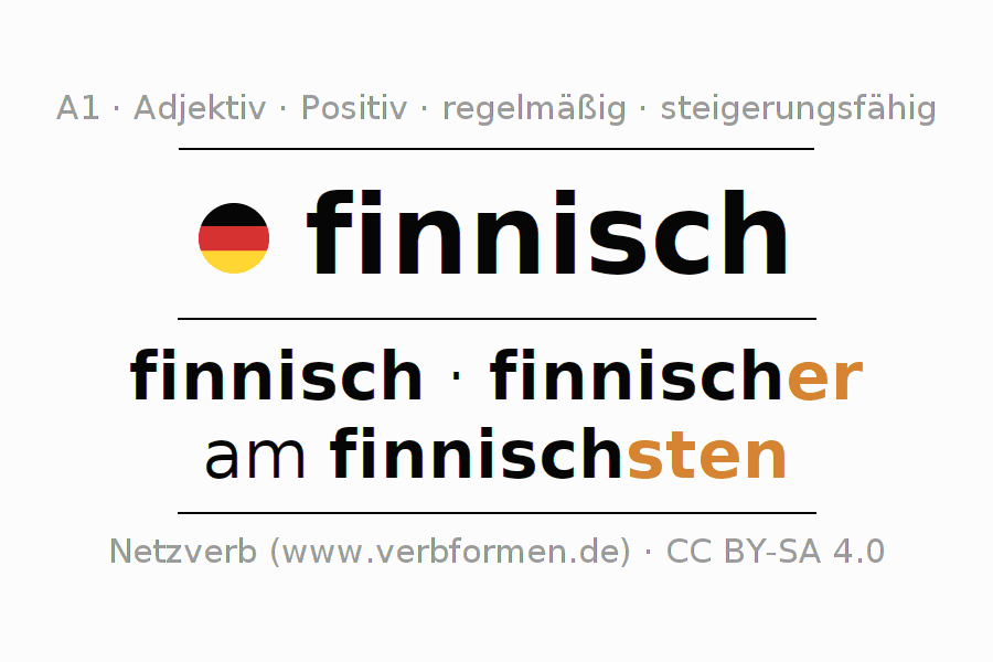 Die Deklination des Adjektivs finnisch erfolgt über die Komparationsformen finnisch,finnischer,am finnischsten. Die Endungen für die Steigerung im Komparativ und Superlativ sind er/sten. Das Adjektiv finnisch kann sowohl attributiv vor einem Nomen mit und ohne Artikel jeweils stark, schwach und gemischt verwendet werden als auch prädikativ in Verbindung mit einem Verb.Man kann hier nicht nur finnisch deklinieren und steigern, sondern alle deutschen Adjektive. Kommentare ☆