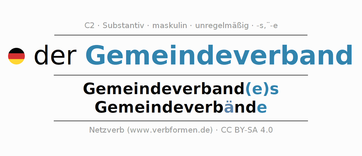 - Plural: die Gemeindeverbände, der Gemeindeverbände, den Gemeindeverbänden, die Gemeindeverbände