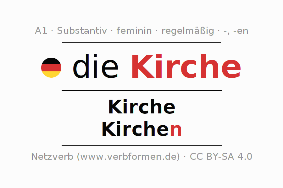 - Plural: die Kirchen, der Kirchen, den Kirchen, die Kirchen