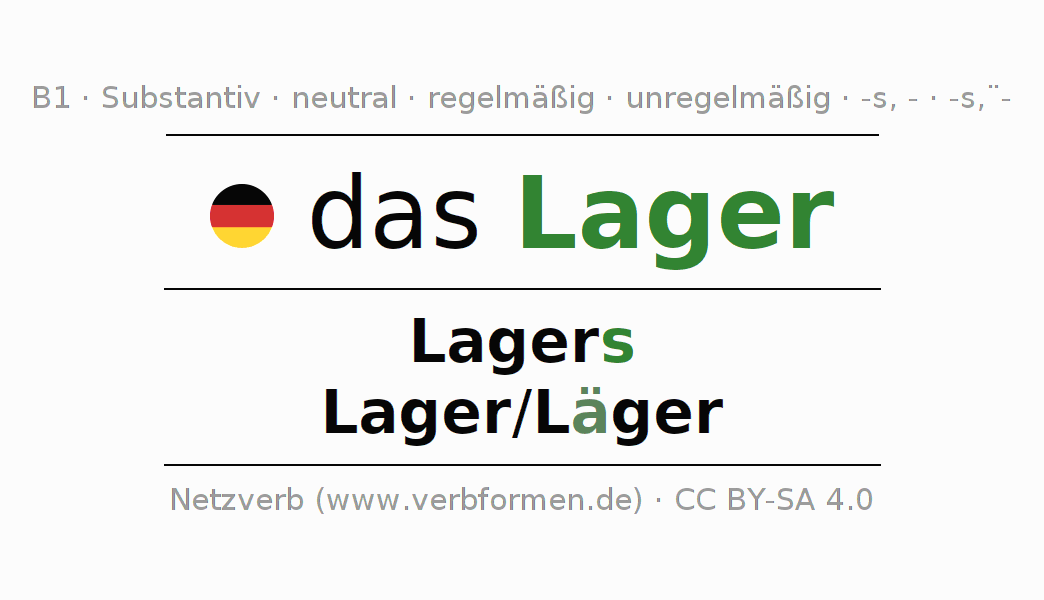 - Singular: das Lager, des Lagers, dem Lager, das Lager