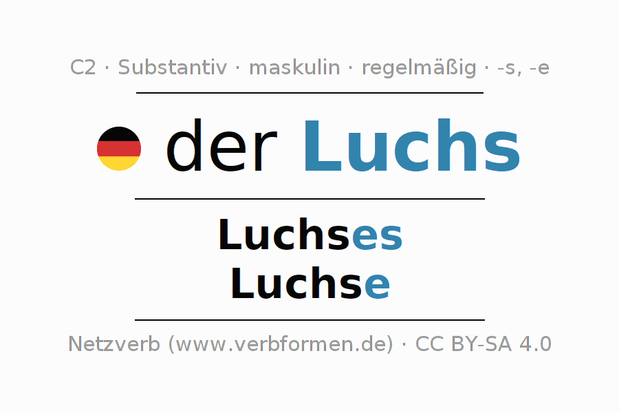 Die Deklination des Substantivs Luchs ist im Singular Genitiv Luchses und im Plural Nominativ Luchse. Das Nomen Luchs wird stark mit den Deklinationsendungen es/e dekliniert. Das Genus bzw. grammatische Geschlecht von Luchs ist Maskulin und der bestimmte Artikel ist "der". Man kann hier nicht nur Luchs deklinieren, sondern alle deutschen Substantive. Das Substantiv gehört zum Wortschatz des Zertifikats Deutsch bzw. zur Stufe C2. Kommentare ☆
