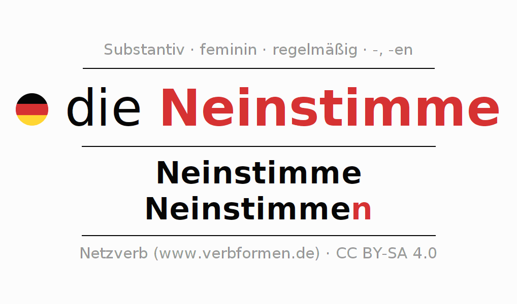 - Plural: die Neinstimmen, der Neinstimmen, den Neinstimmen, die Neinstimmen