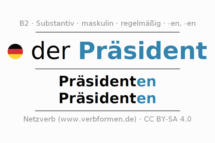 - Singular: der Präsident, des Präsidenten, dem Präsidenten, den Präsidenten