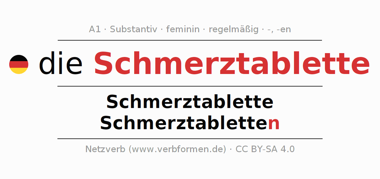 - Plural: die Schmerztabletten, der Schmerztabletten, den Schmerztabletten, die Schmerztabletten