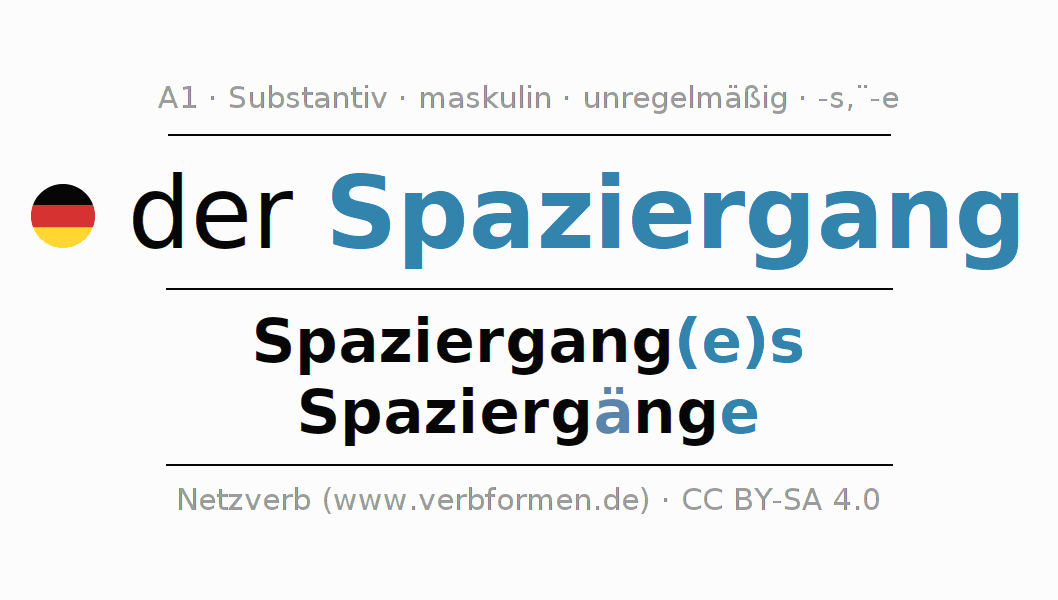 - Plural: die Spaziergänge, der Spaziergänge, den Spaziergängen, die Spaziergänge