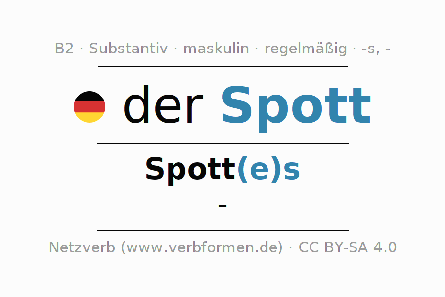 Die Deklination des Substantivs Spott ist im Singular Genitiv Spott(e)s und im Plural Nominativ -. Das Nomen Spott wird stark mit den Deklinationsendungen es/- dekliniert. Es bildet keine Pluralformen. Das Genus bzw. grammatische Geschlecht von Spott ist Maskulin und der bestimmte Artikel ist "der". Man kann hier nicht nur Spott deklinieren, sondern alle deutschen Substantive. Das Substantiv gehört zum Wortschatz des Zertifikats Deutsch bzw. zur Stufe B2. Kommentare ☆