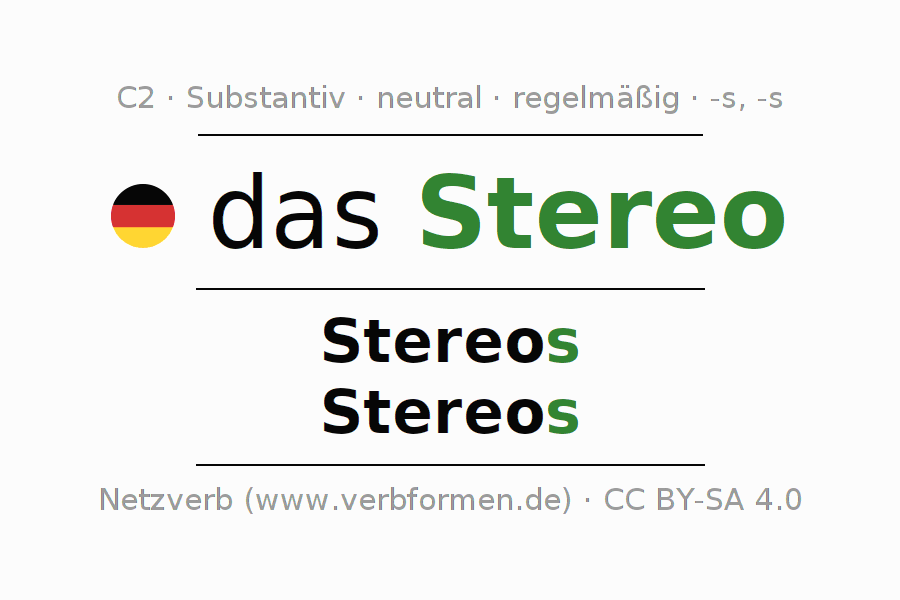 - Plural: die Stereos, der Stereos, den Stereos, die Stereos